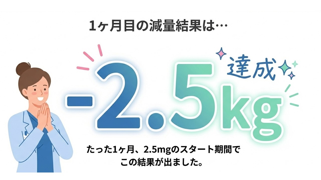 現在は最初の1カ月ということで2.5mgで様子を見ていますが、なんと 2.5kgの減量 に成功しました✨