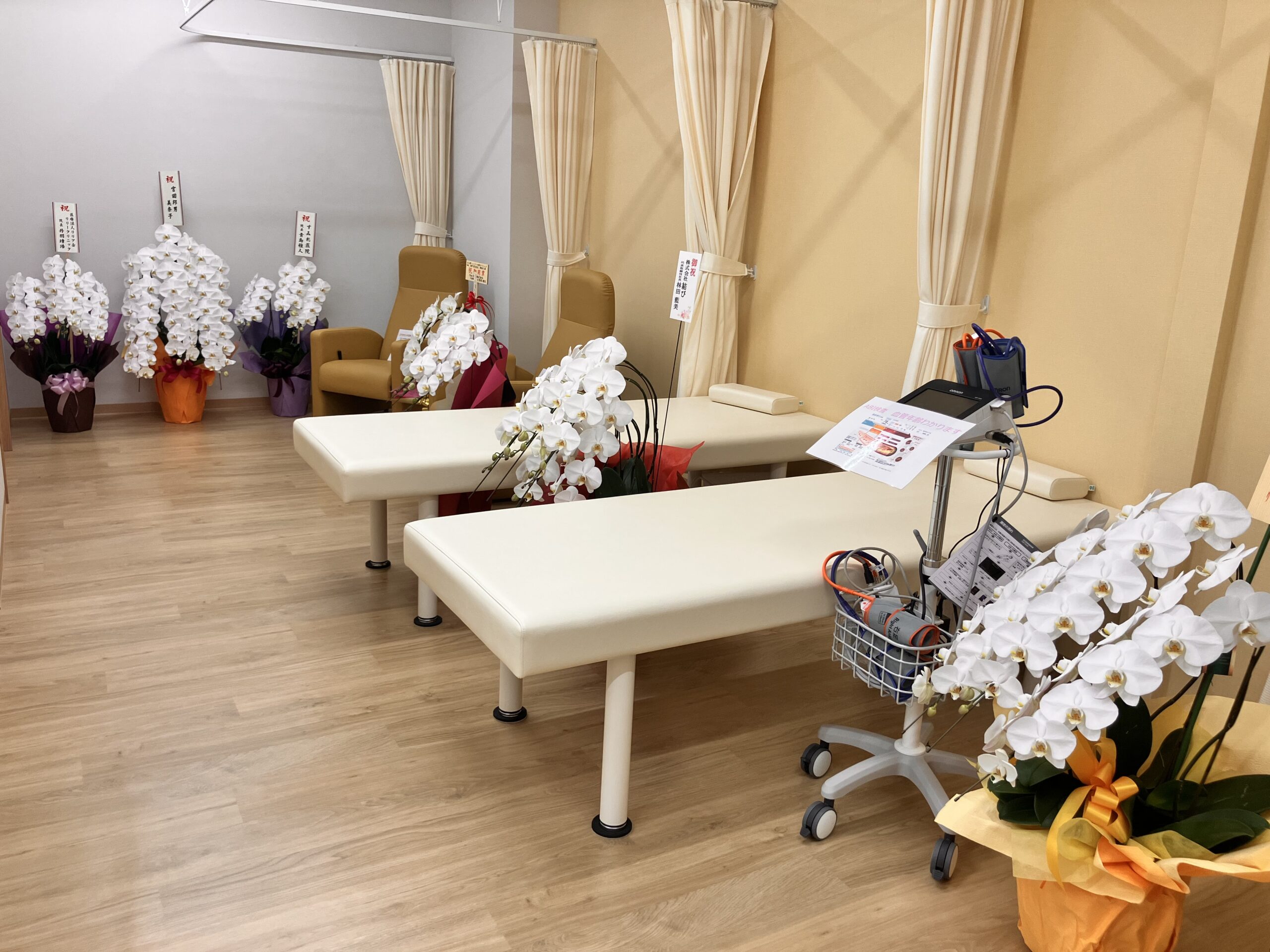 内覧会に先立ち、多くの方々から温かいお祝いのお花をいただきました。華やかな胡蝶蘭をはじめ、色とりどりのお花が院内を明るく彩り、スタッフ一同感謝の気持ちでいっぱいです。