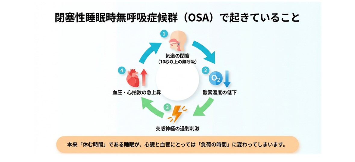 そこで今回のブログでは、睡眠時無呼吸症候群が体の中で何を引き起こし、なぜ心臓や血管の病気につながっていくのかを、医学的エビデンスをもとに、できるだけわかりやすくお話ししていきます。