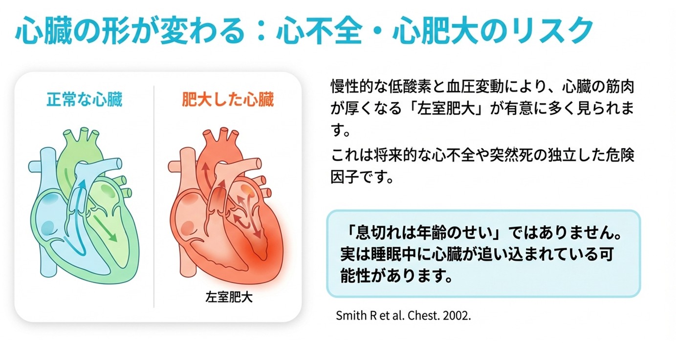 OSAによる慢性的な低酸素状態と血圧変動は、心臓の構造そのものを変化させます。