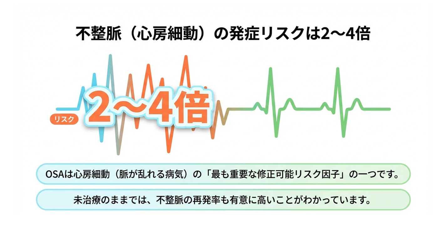 メタ解析では、OSAを有する患者は、OSAのない患者に比べ心房細動の発症リスクが約2〜4倍高いと報告されています【5】。