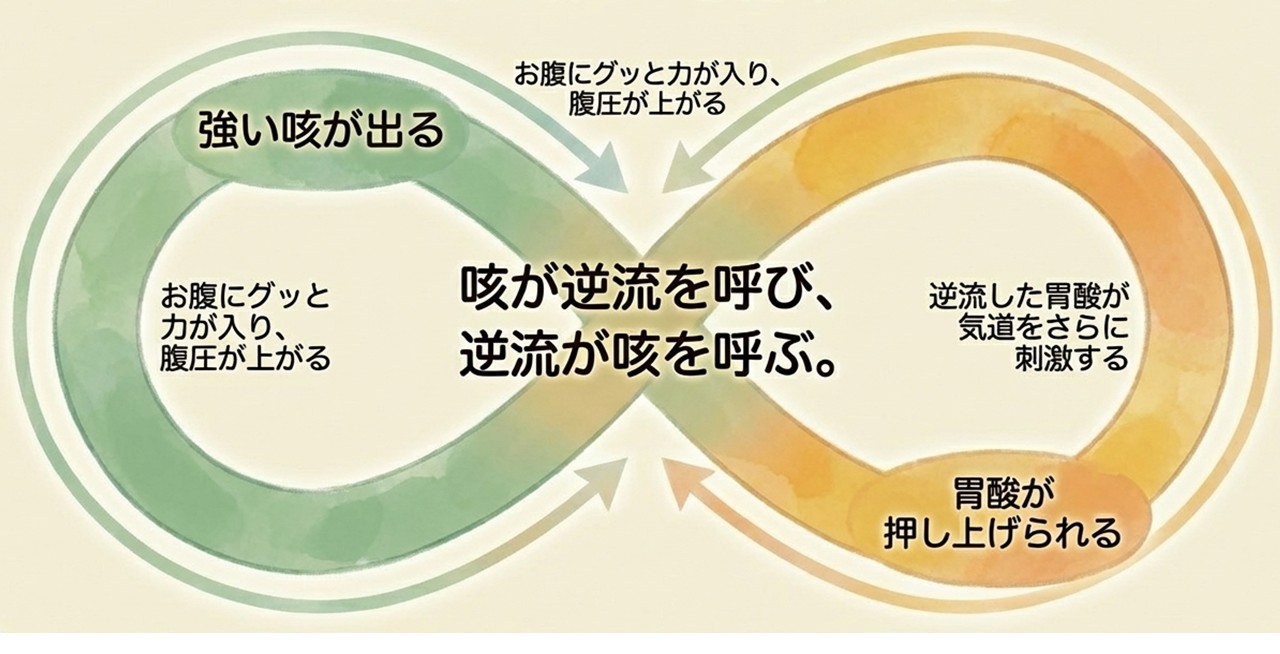 さらに微量の胃酸が気道へ入る微小誤嚥(びしょうごえん)が起きると、直接気道を刺激します。