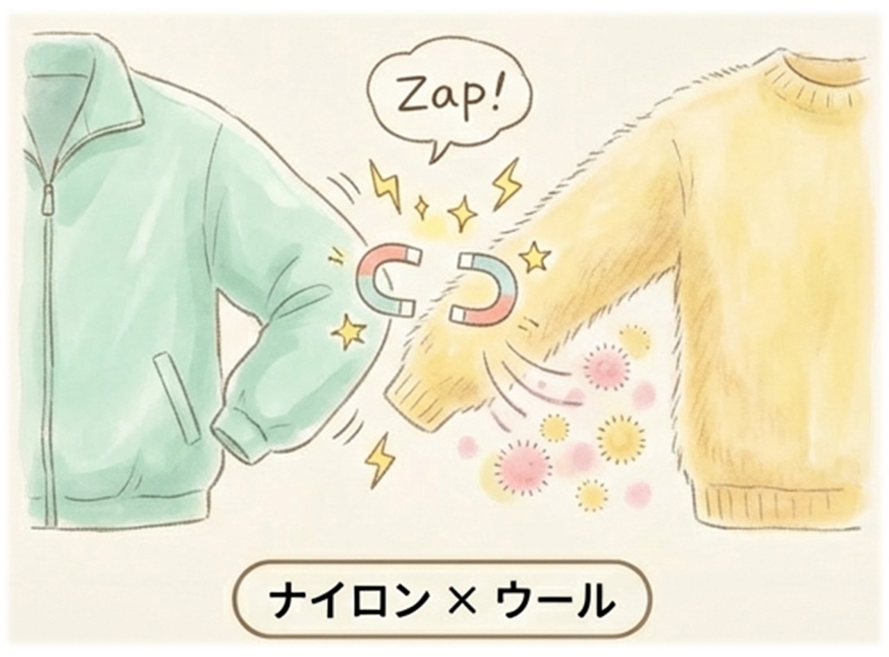 こうした素材同士を重ねると、摩擦で電気が発生しやすくなります。