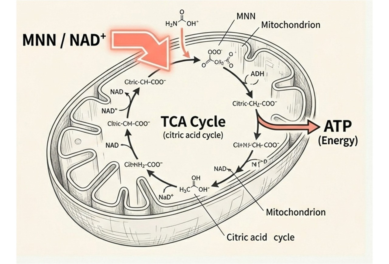 MNNは、体内で「NAD⁺(エネルギー代謝に欠かせない補酵素)」の材料になります。