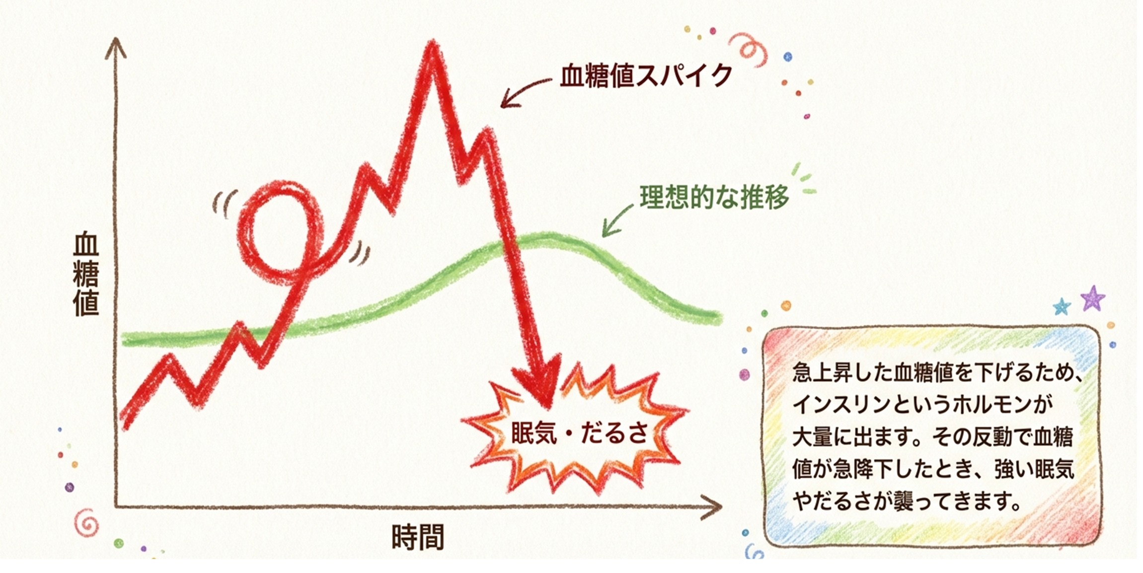 その結果、血糖値が急上昇し、その反動で強い眠気やだるさが出ることもあるんです。
