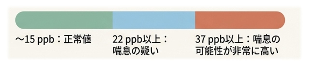 ちなみに、一般成人の正常値は約15ppb程度です。呼気NO値が22ppb以上ならば喘息の疑いがあり、37ppb以上を示す際には、喘息の可能性を強く疑います。ただし、呼気NO値が低いからといって、喘息が否定できるわけではありませんので、この点は注意が必要です。