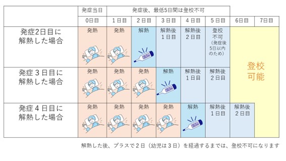 学校保健安全法では、「発症後5日を経過し、かつ解熱後2日(幼児は3日)を経過するまで登校・登園できない」と定められています。社会人の場合も、解熱後2日以上は自宅で安静に過ごすことが推奨されています。