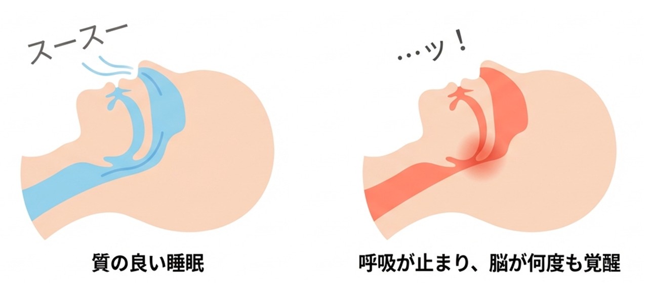 SASの主な原因は「上気道(のどや鼻の奥など)」の閉塞です。睡眠中に喉の筋肉が過度に緩むと、空気の通り道が狭くなり、呼吸が一時的に止まってしまいます。これは「閉塞型睡眠時無呼吸症候群」と呼ばれ、SASの多くを占めます。